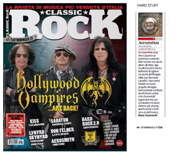 Gigi Cavalli Cocchi è stato il batterista di Ligabue, dei Clan Destino e dei C.S.I. Ha fondato e guidato i Mangala Vallis, oltre ad una lunga serie di prestigiose collaborazioni. Alex Carpani è un compositore, cantante, tastierista e produttore, ha pubblicato quattro album da solista, insieme alla Alex Carpani Band si è esibito in tutto il mondo. Ha collaborato con leggende del rock come David Cross (King Crimson), David Jackson (Van der Graaf Generator), Aldo Tagliapietra (Le Orme) e Bernardo Lanzetti (PFM). Insieme danno vita agli Aerostation, accompagnati dal vivo da Jacopo Rossi, bassista assai apprezzato nel panorama metal italiano e internazionale (Dark Lunacy, Antropophagus, Nerve). L’album d’esordio è un composito e impeccabile prog dalle tinte hard e classic rock che guarda poco al passato (talvolta si possono avvertire sguardi agli Yes degli 80 o agli Asia) e propone un sound moderno e attuale, potente e poderoso. Molto interessante.